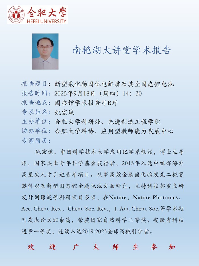 【南艳湖大讲堂】新型氯化物固体电解质及其全固态锂电池