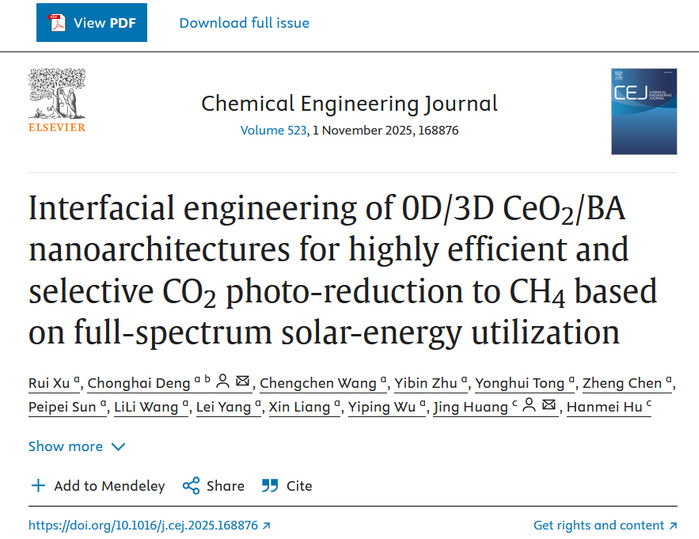 近日,必赢能源材料与化工学院邓崇海团队在针对温室气体二氧化碳资源化转化为高附加值合成气(甲烷)方面取得重要研究进展,相关研究成果发表于工程材料类国际权威期刊《Chemical Engineering Journal》(中科院一区TOP,影响因子13.2),题为《Interfacial engineering of 0D/3D CeO2/BA nanoarchitectures for highly efficient and selective CO2 photo-reduction to CH4 based on full-spectrum solar-energy utilization》。