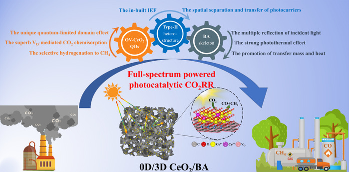 本研究实现了农业废弃生物质的高值化利用,为碳中和目标提供了新材料解决方案。研究团队创新性地利用农业生物质废弃物笋衣为原料,构建出由超薄纳米片组装而成的三维蜂窝状生物质炭气凝胶,再通过绿色微波辅助液相化学反应技术将富含氧空位的零维氧化铈量子点精准锚定其上,研制出一种新型0D/3D分级维纳异质结构且具有全光谱响应的新型复合光催化材料。系统研究揭示了该光催化体系具有太阳能全光谱吸收、光生载流子高效空间分离及光热协同催化等协同作用机制。