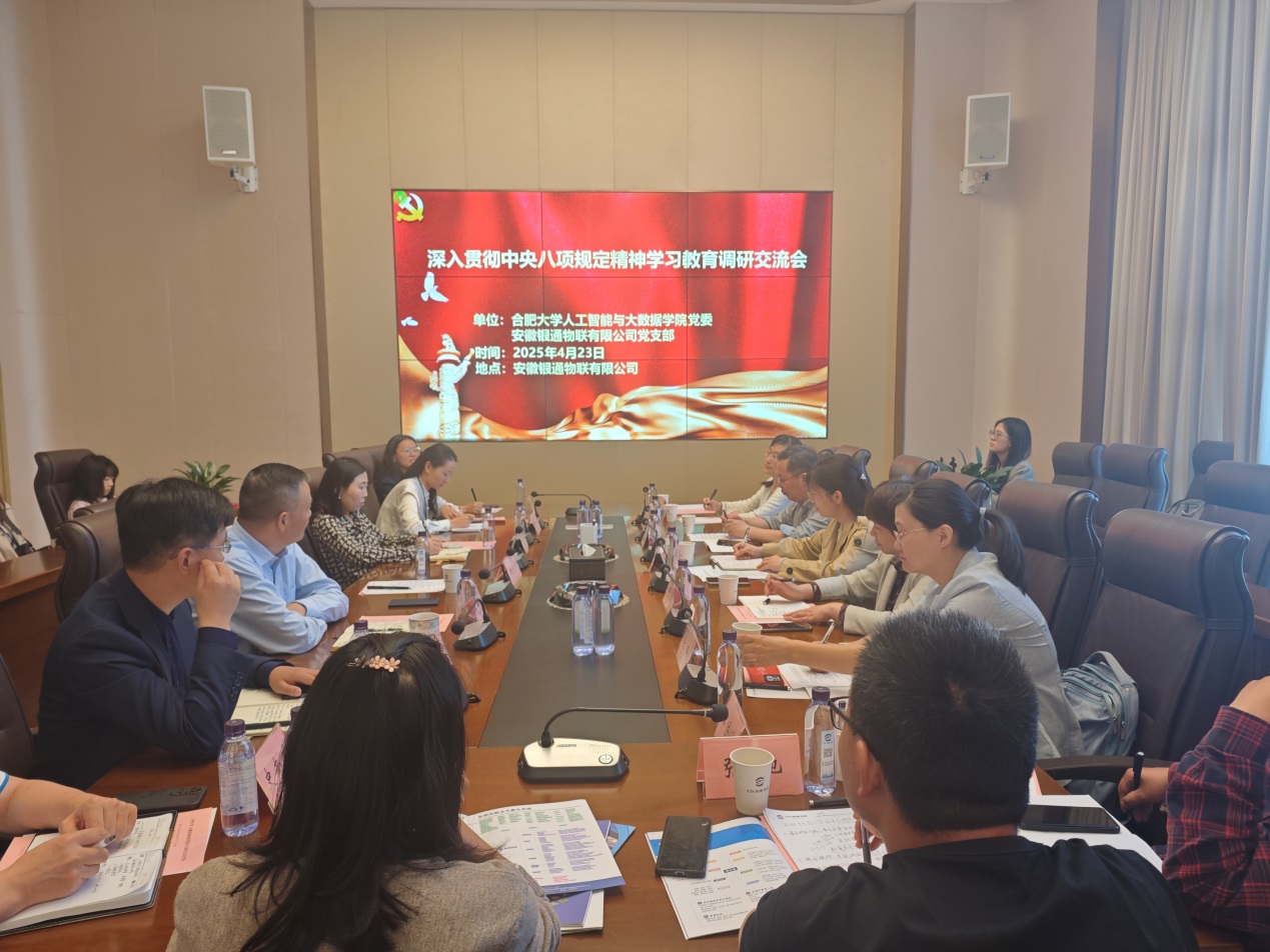 2025年4月23日,人工智能与大数据学院党委赴安徽银通物联有限公司开展调研交流。此次活动是学院党委深入贯彻中央八项规定精神学习教育,全面落实习近平总书记关于“强化校企科研合作,让更多科技成果尽快转化为现实生产力”重要指示精神的具体实践,也是校企双方围绕深化产教融合、服务地方经济和区域发展开展合作的重要举措。学院党委带领相关科研团队教师、支部书记等参加调研。安徽银通物联有限公司董事长陈世久等参加活动。