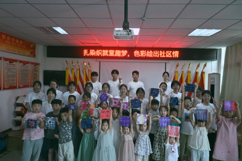 上午,团队抵达颍阳社区,开展扎染知识讲解活动。团队成员聂雨孜向社区小朋友介绍扎染的历史、工艺及技巧。实践环节,团队成员为每位小朋友发放扎染材料,并指导他们进行扎染制作。小朋友们按照所学方法制作,最终呈现出各具特色的扎染作品。同时,团队在社区内发布银发经济健康知识调查问卷,收集社区老年人的健康需求信息,为后续社区服务提供数据参考。