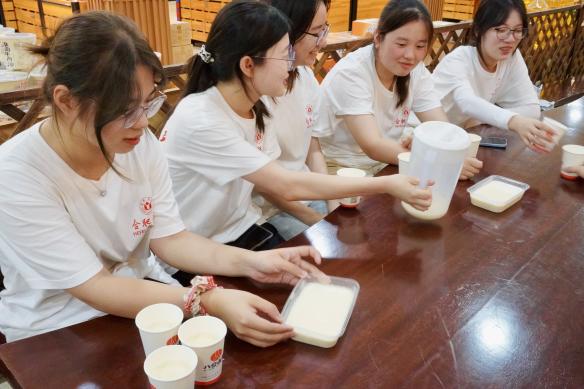 在八公山中国豆腐村,团队成员通过采访当地村民发现,村里虽有古色古香的文旅景观,但实际从事传统豆腐制作的农户数量正在不断下降,产业链有待完善,相关补贴和技能培训不足。在豆腐主题文化园的体验区,团队成员们访谈了工作人员,尝试了亲手磨豆浆、点豆腐,在这一过程中成员们切实感受到了文旅和研学资源对实现产业融合发展的重要意义,也引导成员们更加深入地思考如何找到更多的产业融合着力点,多方位促进乡村产业振兴。
