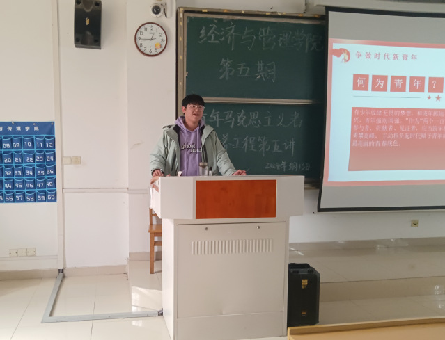 为加强对青年大学生的思想政治引领,着力为党培养和输送青年政治骨干,2024年3月13日经济与管理学院第五期青年马克思主义者培养工程第五讲于一期校园五栋101室成功举行。此次课程由经济与管理学院团委主席支晨涛同学主讲,第五届团委学生会成员与23级新生班干参与学习。 首先,全体成员起立奏唱团歌。随后,支晨涛同学为学员们讲授青马班第五讲﹣“争做时代新青年”。支晨涛从“何为青年”、“清澈的爱,只为中国”、“新时代青年任务”、“争做时代新青年”四个方面内容介绍,引导学员们进一步增强思想自觉,政治自觉和行动自觉,做新时代坚定有为的青年马克思主义者。 此次讲谋圆满结束,同学们倍感振奋、倍受鼓舞,纷纷表示将会不断激发自身潜力,实现人生理想,展现个人价值,让自己成为一个真真正正对祖国和人民有贡献的人。 (经济与管理学院撰稿人:张祎审稿人:姚璇)