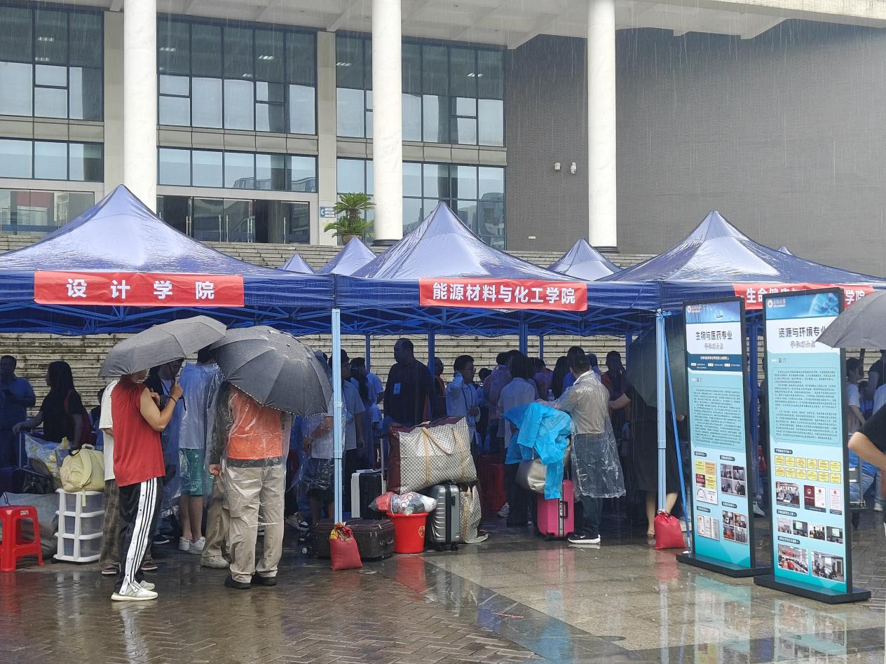 在迎新现场,尽管天空飘着雨,学院的老师和志愿者们早早便驻守在迎新点,他们有的为新生答疑解惑,有的帮助新生搬运行李,有条不紊地开展着报到注册、信息核对、校园指引等各项工作。志愿者们穿着统一的服装,耐心地为每一位新生讲解报到流程,用热情的服务化解了新生和家长们的舟车劳顿。