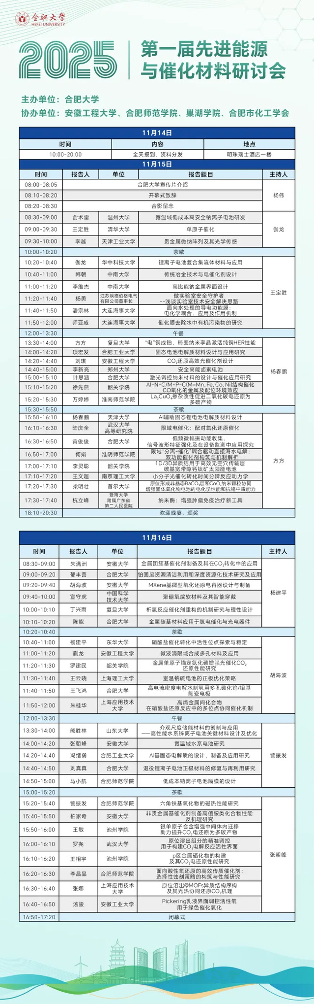 本次研讨会将通过多维度交流,促进能源材料领域基础研究与应用开发的协同创新,为全球碳中和目标提供技术支撑。诚邀国内外学者、企业代表及研究生共聚合肥,共谋合作机遇,共享创新成果!