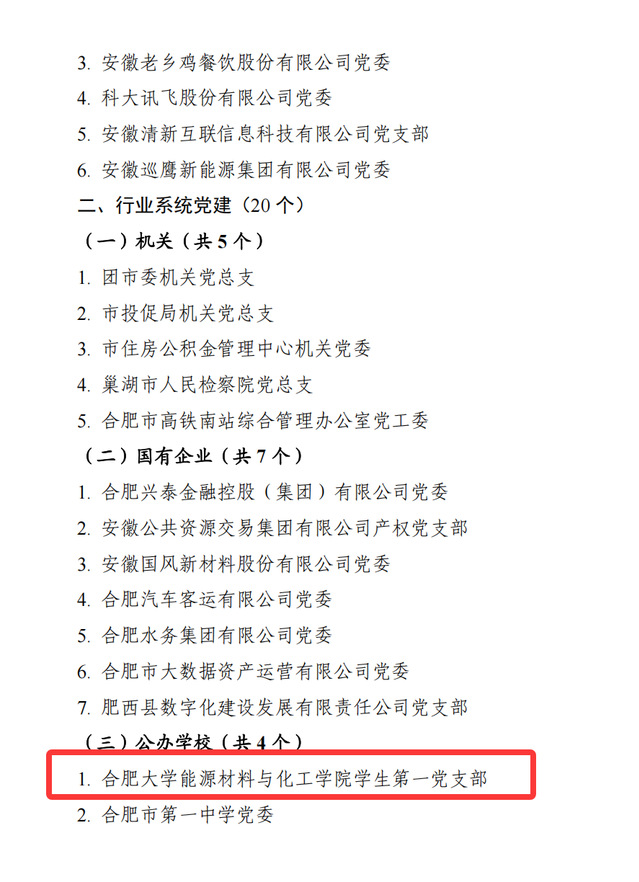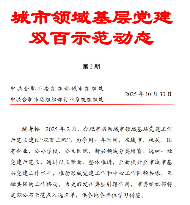 2025年第一季度,合肥市启动城市领域基层党建工作示范点建设“双百工程”,力争用一年时间分类培育、选树一批党建示范点,通过以点带面、整体推进,全面提升全市城市基层党建工作水平。经学校党委推荐,能源材料与化工学院第一党支部入选市委组织部城市领域基层党建双百示范点(第二批),是全市公办高校唯一入选党支部。