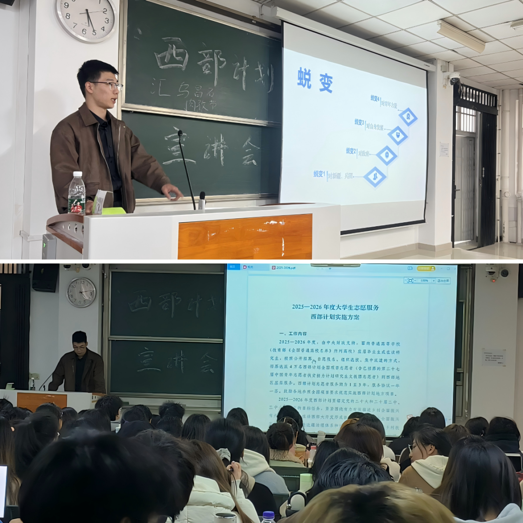 为深化青年学子对大学生西部计划的认识,激发服务西部、奉献基层的热情,3月31日下午,经济与管理学院在一期4-107教师举办“青春赴西部 奋斗正当时”大学生西部计划志愿者感悟分享活动。学院就业联络员、辅导员代表及200余名学生参会,活动特邀学院2020级优秀毕业生、现担任大学生西部计划志愿者的刘晨阳担任主讲。 活动伊始,刘晨阳以“扎根边疆 逐绿前行”为题,结合自身经历展开分享。作为学院2020届会计学专业毕业生,他于2024年通过大学生西部计划志愿者选拔,远赴西部开展志愿服务工作。通过图文并茂的PPT和纪实视频,他生动讲述了在工作单位参与生态治理、环境监测、产业调研等工作的一线故事。