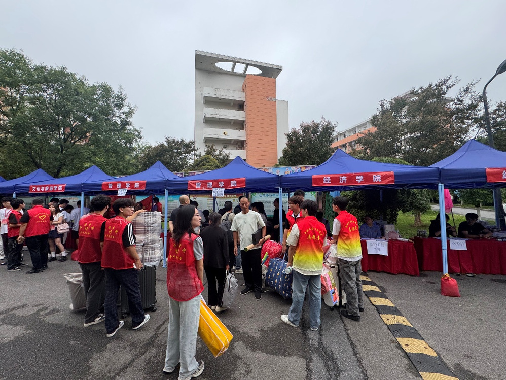 9月9日清晨,迎新工作正式启动。为方便新生报到入住,校园内随处可见温馨的欢迎标语和清晰的指引牌。经济学院的志愿者们在竹苑和香怡社区设置服务点,身穿统一的红色马甲,佩戴工作证,为新生提供行李搬运、路线指引、报到流程讲解等“一站式”服务,用热情与耐心驱散新生初来乍到的陌生感。同时,学院领导亲临迎新现场开展慰问工作,他们的到来与关怀,不仅体现了对迎新工作的高度重视,更让坚守岗位的工作人员与初来乍到的新同学倍感温暖、深受鼓舞。