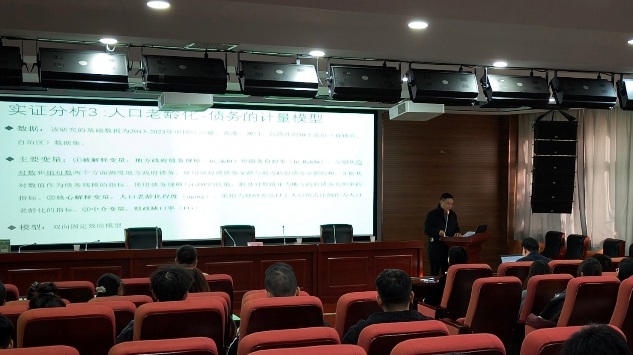 2025年11月3日,南京财经大学朱军教授以“人口老龄化时代的公共债务问题”为主题开讲2025年秋季南艳湖大讲堂系列讲座。经济学院教师以及24级、25级金融专业硕士研究生参加了讲座学习,讲座由经济学院院长江玉荣主持。
