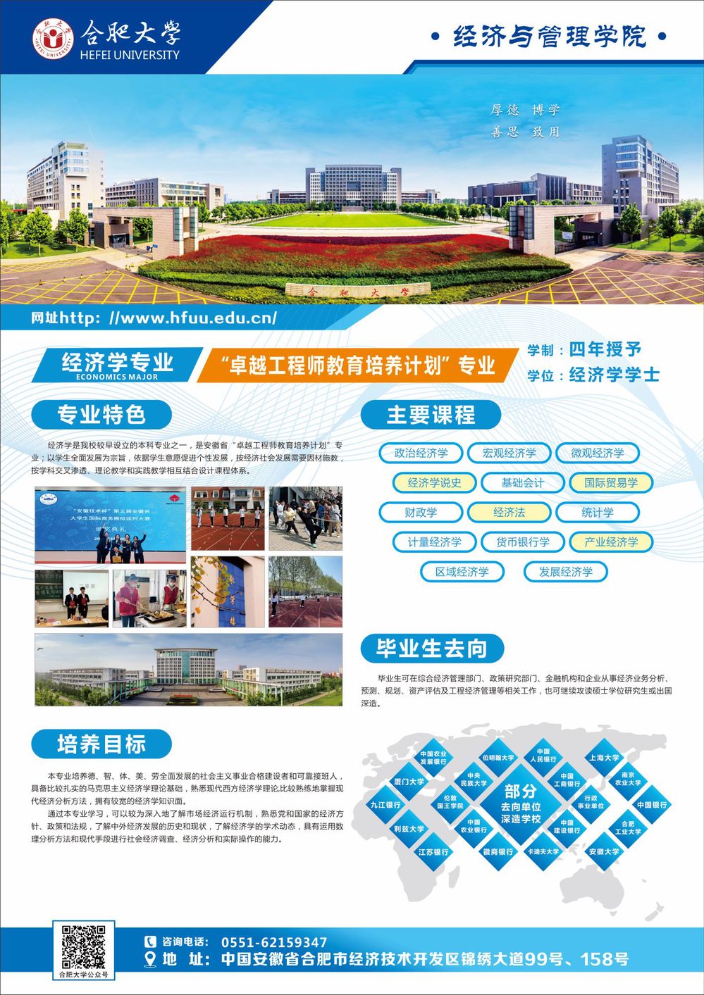 经济学(本科) 咨询电话:0551-62159347 省级“卓越经济工程师教育培养计划”专业 学 制:四年 授予学位:经济学学士 培养目标及特色:本专业培养德、智、体、美、劳全面发展,具备马克思主义经济学理论基础,熟悉现代西方经济学理论,熟练掌握现代经济分析方法,知识面较宽,具有向经济学相关领域扩展渗透能力的专业类人才;同时,根据必赢地方性、应用型、国际化的办学定位,注重对学生进行理论教学与实践锻炼同步结合,使学生具有国际宏观视野,并熟悉国内外经济现状,能够理论联系实际,同时具备较强适应性能力的高层次应用型人才。本专业注重培养理论基础扎实、逻辑思维清晰、实践能力较强的复合型人才。 毕业生发展方向:毕业生可在政府部门、政策研究部门、金融部门和相关企业从事经济分析、预测、规划和经济管理等相关工作;也可继续攻读硕士学位研究生或出国深造。