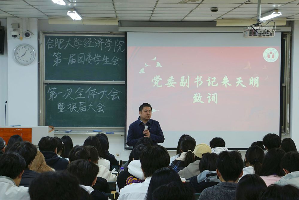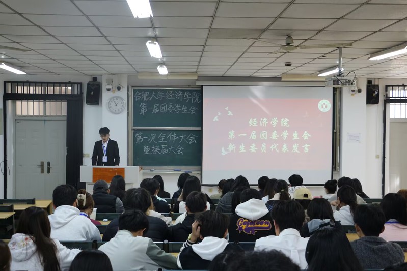 2025年11月4日中午12:30,经济学院团委学生会第一次全体会议暨换届大会在一期4-107教室顺利举行。学院党委副书记朱天明、团委负责人陈思超出席会议,原经济与管理学院第一届团委学生会主席团应邀参加会议。大会由学生会科创部斯陈圆主持,伴随着激昂的团歌旋律,全体与会人员肃然起立、齐声高唱,会议正式拉开帷幕。