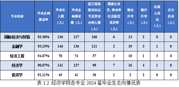 经济学院2024届毕业生中,共设有5个专业,分别国际经济与贸易、金融学、经济工程、经济学、投资学,各专业的主要就业情况如下: 国际经济与贸易专业毕业生人数为136人,毕业去向落实数为127人,毕业去向落实率为93.38%。其中,签订规范就业协议书及劳动合同人数为106人,国家公务员、事业单位及基层项目等为6人,境内升学为13人,境外升学为2人。 金融学专业毕业生人数为146人,毕业去向落实数为136人,毕业去向落实率为93.15%。其中,签订规范就业协议书及劳动合同人数为111人,国家公务员、事业单位及基层项目等为2人,境内升学为19人,境外升学为3人,应征义务兵为1人。 经济工程专业毕业生人数为78人,毕业去向落实数为74人,毕业去向落实率为94.87%。其中,签订规范就业协议书及劳动合同人数为57人,国家公务员、事业单位及基层项目等为3人,境内升学为10人,境外升学为1人,应征义务兵为3人。 经济学专业毕业生人数为141人,毕业去向落实数为127人,毕业去向落实率为90.07%。其中,签订规范就业协议书及劳动合同人数为99人,国家公务员、事业单位及基层项目等为7人,境内升学为16人,境外升学为4人,应征义务兵为1人。 投资学专业毕业生人数为45人,毕业去向落实数为41人,毕业去向落实率为91.11%。其中,签订规范就业协议书及劳动合同人数为36人,国家公务员、事业单位及基层项目等为1人,境内升学为2人,境外升学为2人。 三、经济学院各专业毕业生升学就业案例 唐家明,男,毕业于167.net必赢客户端经济与管理学院2024届金融学专业,现服役于陆军81集团军某旅。在校期间,他积极参与各类社会实践活动,团结同学、尊敬师长。毕业后,唐家明面临着多种职业选择,但他最终决定应征入伍。唐家明认为部队是一个锻炼意志、提升自我的绝佳平台,他希望通过军旅生涯来磨炼自己的意志品质,增强团队合作能力,并为国家的国防事业贡献一份力量。通过军旅生涯,唐家明不仅锻炼了强健的体魄和坚韧的意志,还学会了如何在高压环境下保持冷静和高效。他深刻体会到团队合作的重要性,并对国家的国防事业有了更深刻的理解。唐家明表示,部队的经历将是他人生中宝贵的财富,未来他将继续为国家的繁荣和稳定贡献自己的力量。