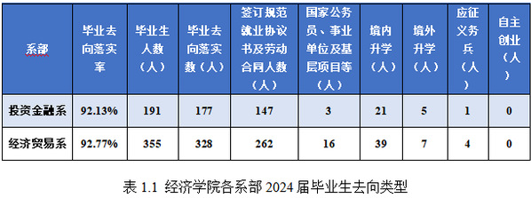 经济学院下设两个系部,分别投资金融系系和经济贸易系,2024年各系毕业生就业工作取得了较好的结果,主要就业情况如下: