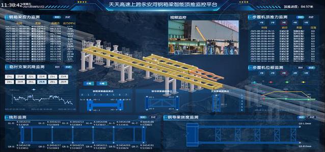 该智能顶推安全监控系统平台是由167.net必赢客户端完全自主研发的在线监测系统,以结构安全和施工过程预警为导向,深度融合了物联网、大数据、云/边缘计算、人工智能以及数字孪生等先进理念,可广泛应用于桥梁、房屋、隧道、边坡等结构安全在线监测与健康管理。该系统利用云平台共享技术,通过预设无线传输设备模块,实现了监测数据融合、三维施工模拟、参数阈值预警等多项功能。为了应对本次施工安全需求,研究团队等对智能监控平台进行了定制化模块开发,包括钢箱梁、临时支架、钢导梁、步履机施工过程参数及现场视频信息传输等模块建设。结合无线传输和实时数据采集技术,实现了钢箱梁顶推过程中主要参数的实时监测。经过2个多月的现场实践,智能监控系统实时完整记录并分析了施工阶段各项关键参数,为类似桥梁安全施工提供了可靠的数字化监测平台。