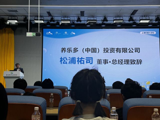 方波馆长的开场词高屋建瓴,强调了科普对于食品领域的重要性,为接下来的精彩内容奠定了基础。随后,养乐多中国投资有限公司的松浦祐司董事总经理登台致辞。松浦祐司董事总经理详细地向同学们介绍了养乐多里面益生菌的好处,让同学们对益生菌的作用有了更深入的了解。他的讲解生动形象,结合实际案例,使同学们深刻认识到益生菌在维护人体健康方面的重要价值。紧接着,上海科普教育发展基金会袁正宏副理事长致辞。袁正宏副理事长从科普教育的角度出发,阐述了举办此次食品专题报告会的意义,鼓励同学们积极参与科普活动,提高自身科学素养。
