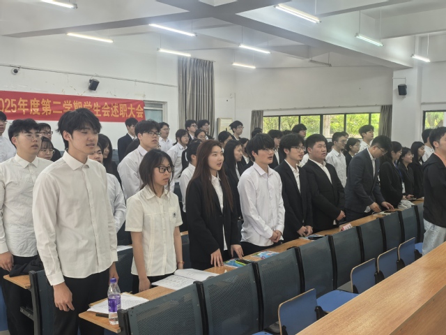 大会伊始,由主持人旷家昱上前致辞,宣布大会开始。大会第一项,全体起立,奏唱共青团团歌,在一声声庄严的团歌渲染下,全体成员不禁面容庄重,共唱共青团团歌。大会第二项,由各部门部长述职,各部长讲述了各自部门的工作成果、不足之处、未来规划以及感谢寄言。大会第三项,由主席团代表成晓超进行全面述职。在过去的一年里,学生会秉持“全心全意为同学服务”的宗旨,扎实推进各项工作,丰富同学们课余生活,展现了生会积极进取、追求卓越的决心。大会第四项,院团委负责人杨林对学生会的工作做出指导,希望各部门充分发挥学生组织的示范引领作用,为学校发展和同学成长贡献更多青春力量。大会最后一项,李秀娟做总结讲话。她对学生会成员的辛勤付出给予高度赞扬,强调学生会要始终坚持正确的政治方向,并结合自身经验希望学生会以此次述职大会为契机,总结经验、正视不足,加强自身建设。