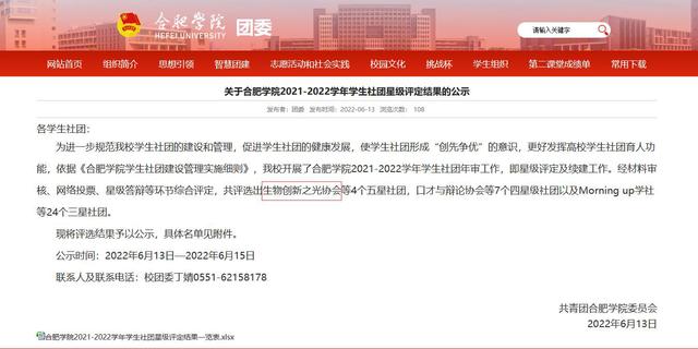 为进一步规范对学生社团的管理,促进学生社团的健康发展,促进学生社团形成“创先争优”的意识,营造良好的学生社团发展氛围,依据《合肥学院学生社团建设管理实施细则》,经学生社团建设管理评议委员会研究,共青团合肥学院委员会决定开展合肥学院2021-2022学年学生社团年审工作,即星级评定及续建。