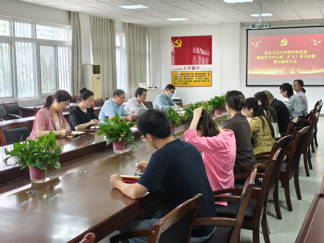 6月3日下午,语言文化与传媒学院在学院大会议室召开党委理论中心组(扩大)学习会,专题开展警示教育学习,学院领导班子成员、党委委员、纪委委员、科级干部及各党支部书记参加会议,会议由院党委书记储昭辉主持。