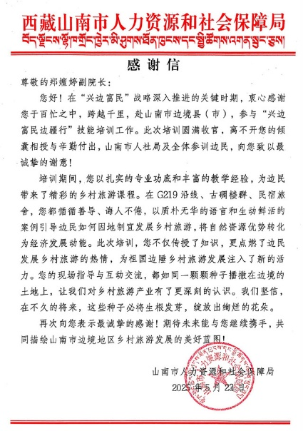 郑嬗婷副院长作为安徽省人社厅组织的文旅专家,跨越千里,远赴西藏,参加了历时七天的“兴边富民边疆行”活动,克服高原反应深入乡镇一线,通过现场指导、专业授课等方式为边民传授乡村旅游经营管理知识,获山南市人社局致信感谢。党员教师张业臣、王汝幸带领支部教师和学生赴铜陵市义安区开展调研,承担该区旅游资源普查、“十五五”文化和旅游发展规划编制服务项目;并在义安区文化旅游局开展培训,指导当地旅游资源的开发与利用。