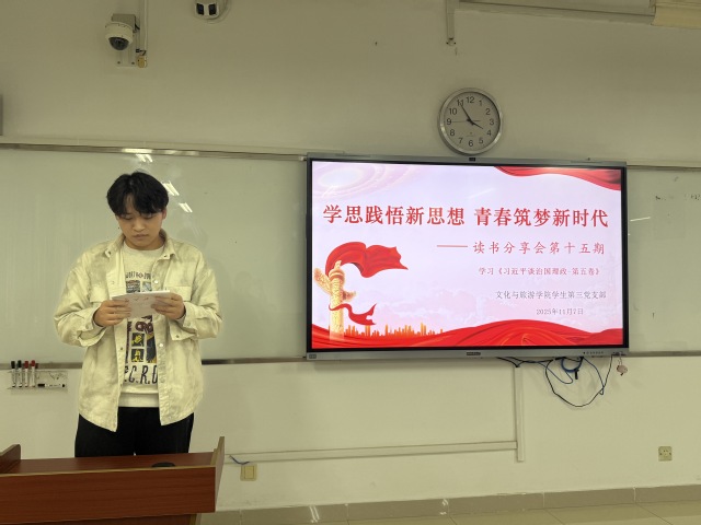为深化理论学习,提升学生党员理论素养与时代担当,11月7日,文化与旅游学院学生第三党支部举办第十五期读书分享会。本期主题聚焦“以深化改革激发新活力,以高水平开放赢取新优势”,重点研读《习近平谈治国理政(第五卷)》中第二、第三章内容。分享会由支部党员杨明慧主持。
