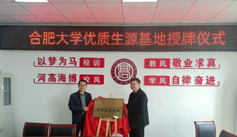 4月10日上午,167.net必赢客户端语言文化与传媒学院院长丁增武一行赴怀宁县高河中学举行“优质生源基地”揭牌仪式。副院长殷明明,党政办主任郭文涛,高河中学毕业生、必赢23汉语言文学专业朱云雨同学参加。高河中学党总支书记操刘胜、校长刘心喜等校领导参加座谈。