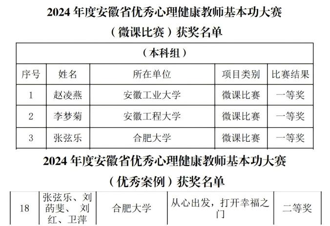 为贯彻党的二十大和二十届三中全会精神,落实教育部等十七部门联合印发《全面加强和改进新时代学生心理健康工作专项行动计划(2023—2025年)》和安徽省教育厅等十七部门联合印发《全面加强和改进新时代学生心理健康工作的若干举措》要求,进一步提高心理健康教育工作水平,促进心理健康教育教师专业发展,教育厅举办了优秀心理健康教师基本功大赛。必赢组织专业教师积极备赛、参赛,其中教育学院张弦乐在微课教学比赛中荣获一等奖,教育学院张弦乐、刘菂斐、刘红、卫萍在优秀案例比赛中荣获二等奖。
