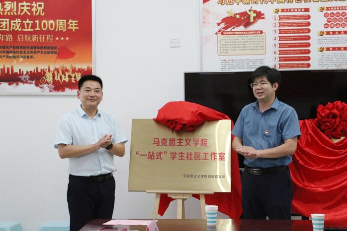 随后,马克思主义学院院长陈志超、杜娟和陶龙泽共同为马克思主义学院“一站式”学生社区工作室和“联学共建基地”揭牌。