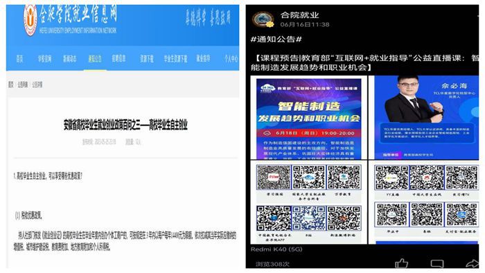 为加强就业创业政策宣传,学生处就业指导中心创新宣传方式,扩大宣传覆盖面。线上通过微信公众号、QQ号等新媒体平台推送了教育部“互联网+就业指导”公益直播课11期、安徽省高校毕业生就业创业政策百问等内容,针对赴省内艰苦边远地区基层单位就业的毕业生定向推送了安徽基层就业学费补偿相关政策,收集并整理了高校毕业生就业创业政策(2022--2023)推动就业政策学习。线下组织各二级学院相关人员参与2023年就业工作专题培训会、省级“启明星”就业指导专家进校园等就业政策宣讲培训活动,组织师生参加永嘉县全国巡回引才合肥站活动、首届湖州未来人才大会等省市各地人才宣讲活动。