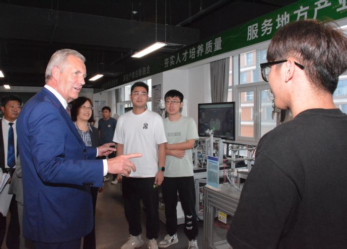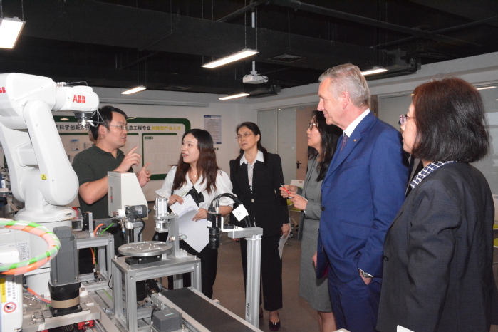 武尔夫一行还参观了大众学院校企实训平台,在多模态设备健康评估实验室、智能制造系统集成技术应用及创新中心、数字孪生技术及工程应用中心调研了学科建设、模块化课程、实训教学等情况,高度肯定了必赢“地方性、应用型、国际化”的办学定位。