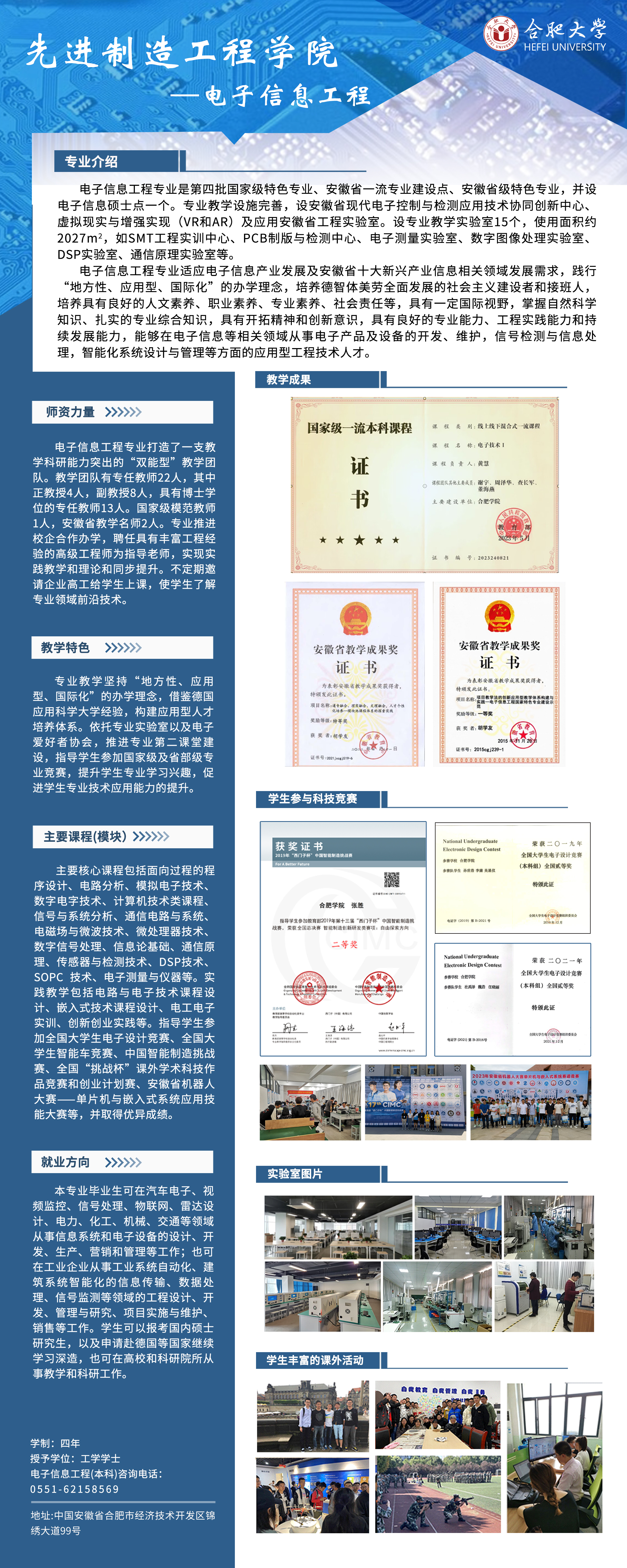 培养目标及特色:本专业培养德、智、体、美、劳全面发展,服务安徽地方经济建设,具备电子信息系统设计、制造、应用开发与生产的应用型人才。专业设置了信号处理、信号检测、电子工程等方向。与德国高校深入交流,借鉴德国先进人才模块化培养理念,建立模块化人才培养体系。与多家大中型企业建立了长期、稳定的实习基地,为本专业学生实习与实践提供工程实践平台,有效地促进了本专业培养目标的达成以及学生综合能力的提升。
